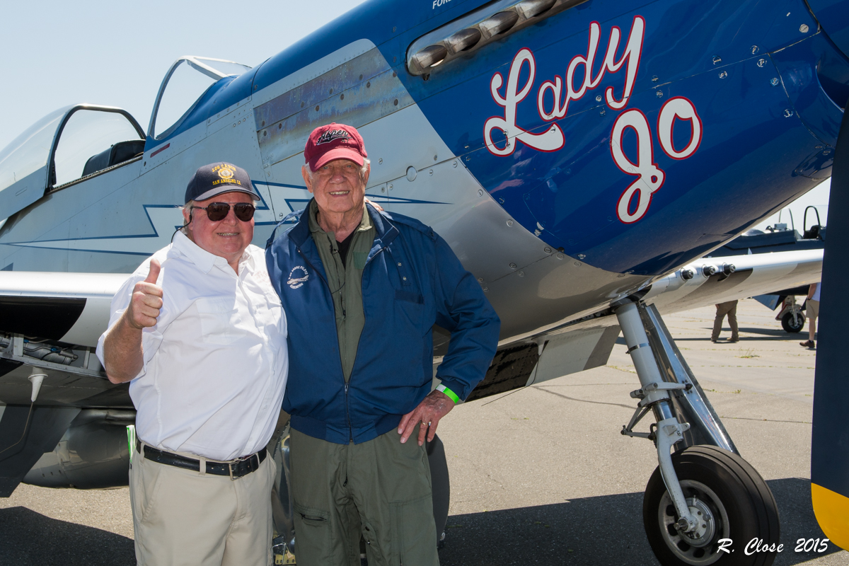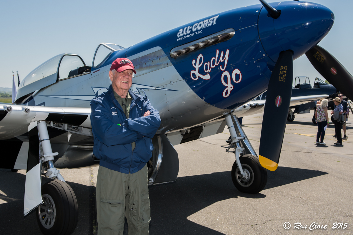 A large crowd gathered to witness Titus’ flight on April 18th, and to hear the General and other veterans speak afterwards. Titus slipped comfortably into the rear seat of Darryl Bond’s magnificent dual-control Mustang ‘Lady Jo’ with her pilot, Dan Vance at the controls in the front seat. The Mustang’s Merlin engine soon crackled to life and Vance slowly taxied the fighter to the main runway… weaving from side to side to see the route past the TF-51’s elegant nose. And then they were off… tearing down the crazed concrete slabs of Petaluma Municipal Airport’s runway and lifting gracefully into the air, the engine’s throaty music echoing off the nearby hills. The crowd cheered as they recognized what they were witnessing… one of the last of the Greatest Generation in his element… In A Mustang!