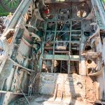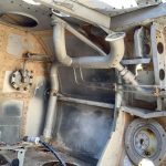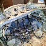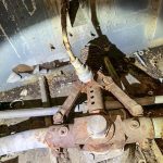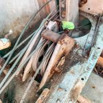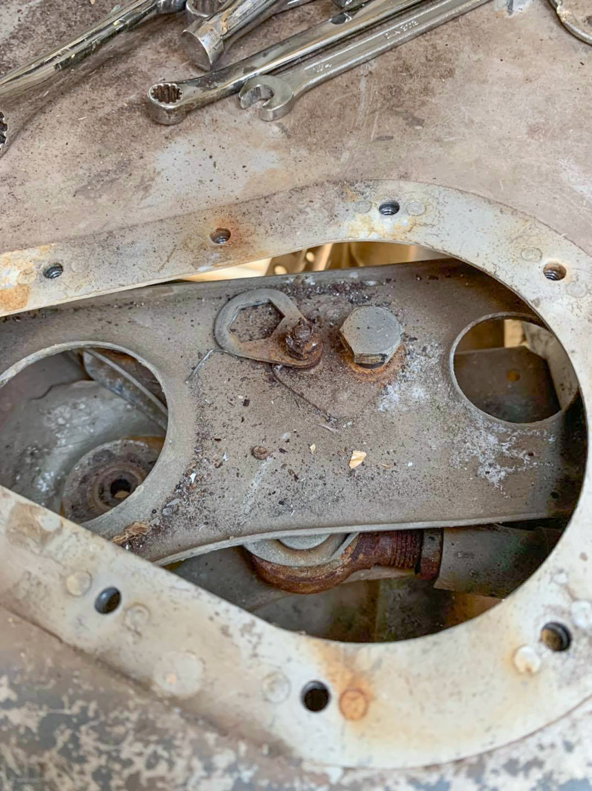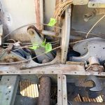 Some of the bearings attaching the elevator torque tube to the airframe had seized, making it difficult to remove the associated assemblies. Aaron Simmons had to grind down a 2″ wrench so it would fit the restricted space surrounding the torque tube attach point housing, allowing its removal. He carefully disassembled more of the various cable assemblies and bell-crank assemblies associated with throttle controls, trim and other key pilot input mechanisms. Some of these components will be set aside for later restoration, or until replacement can be acquired, but others will be addressed straight away.
