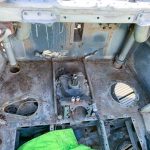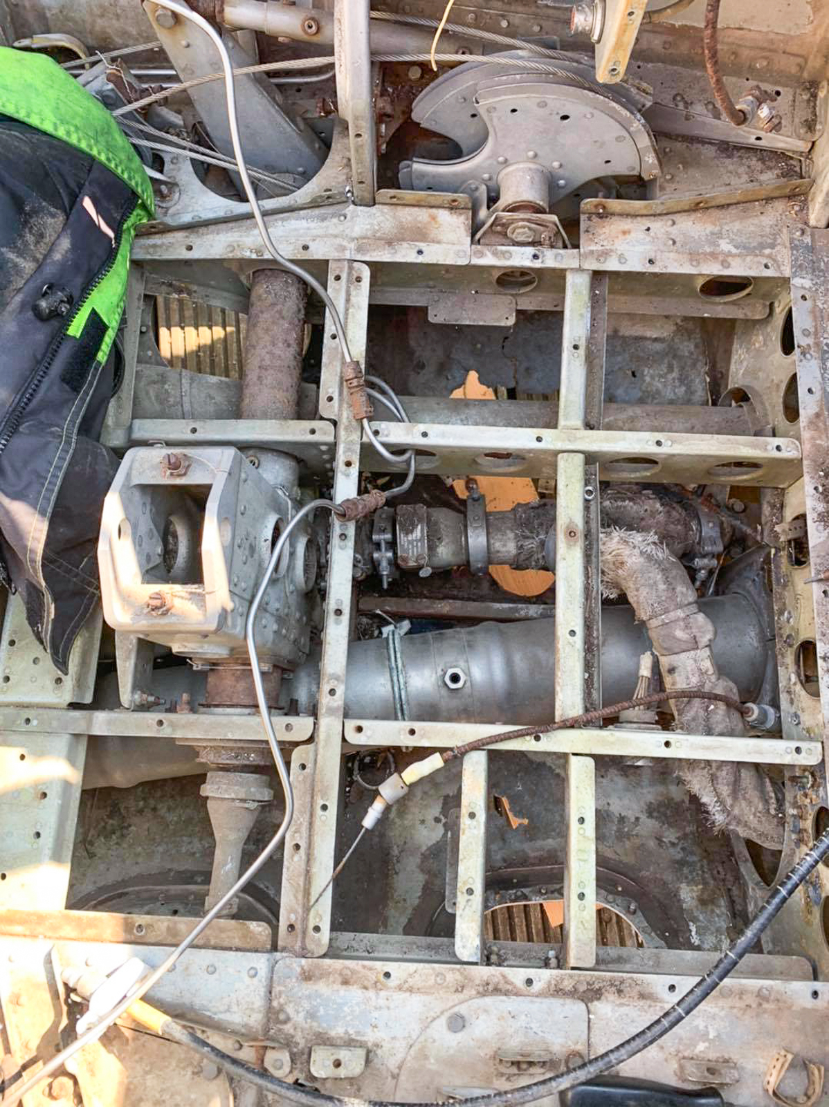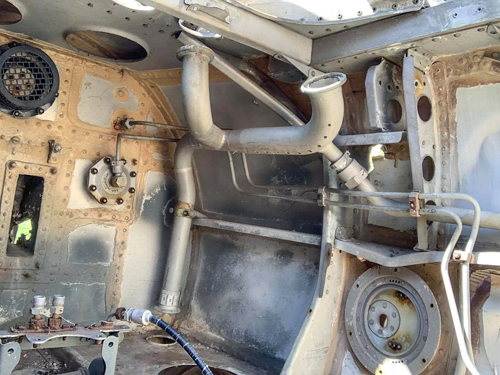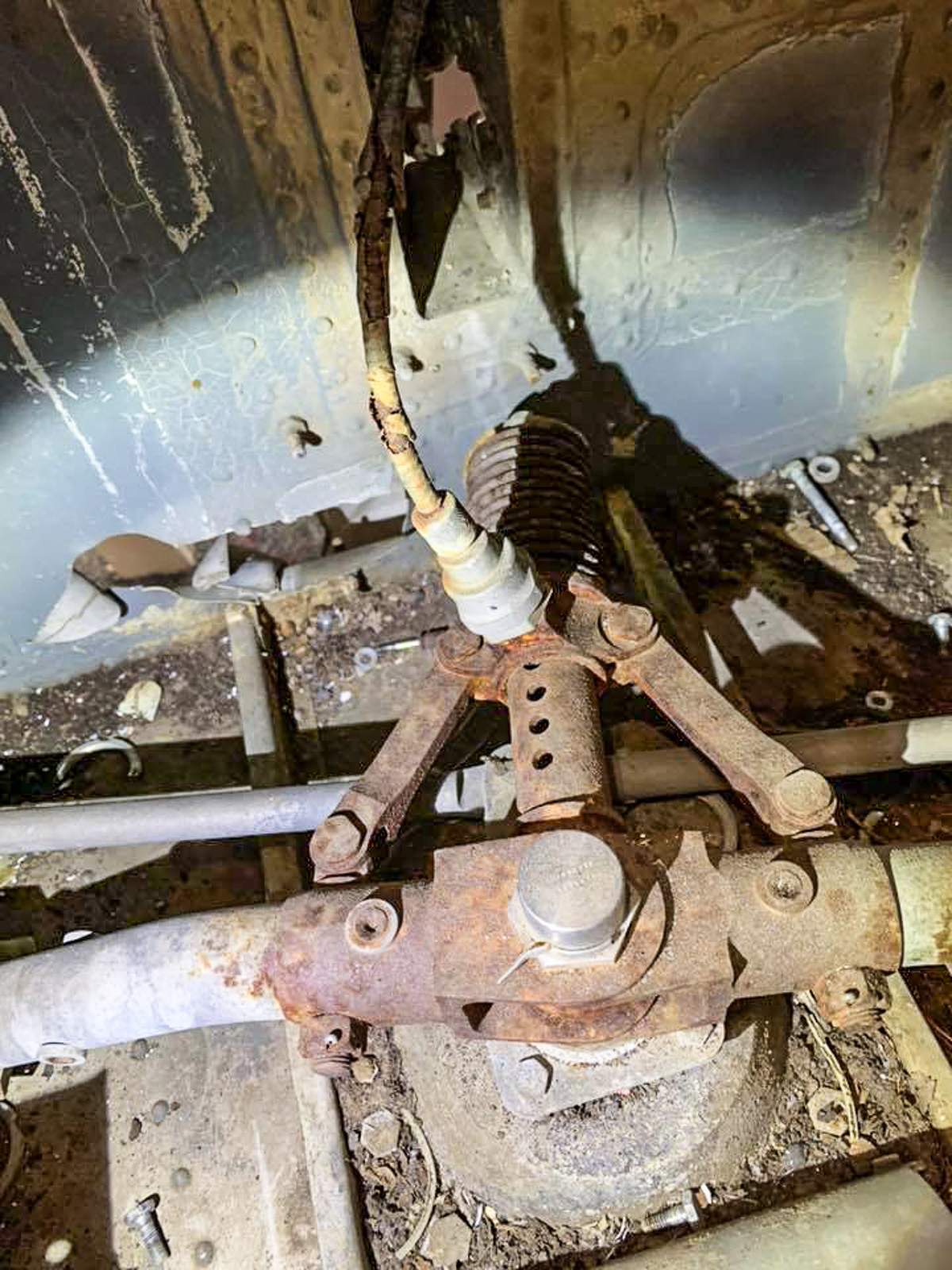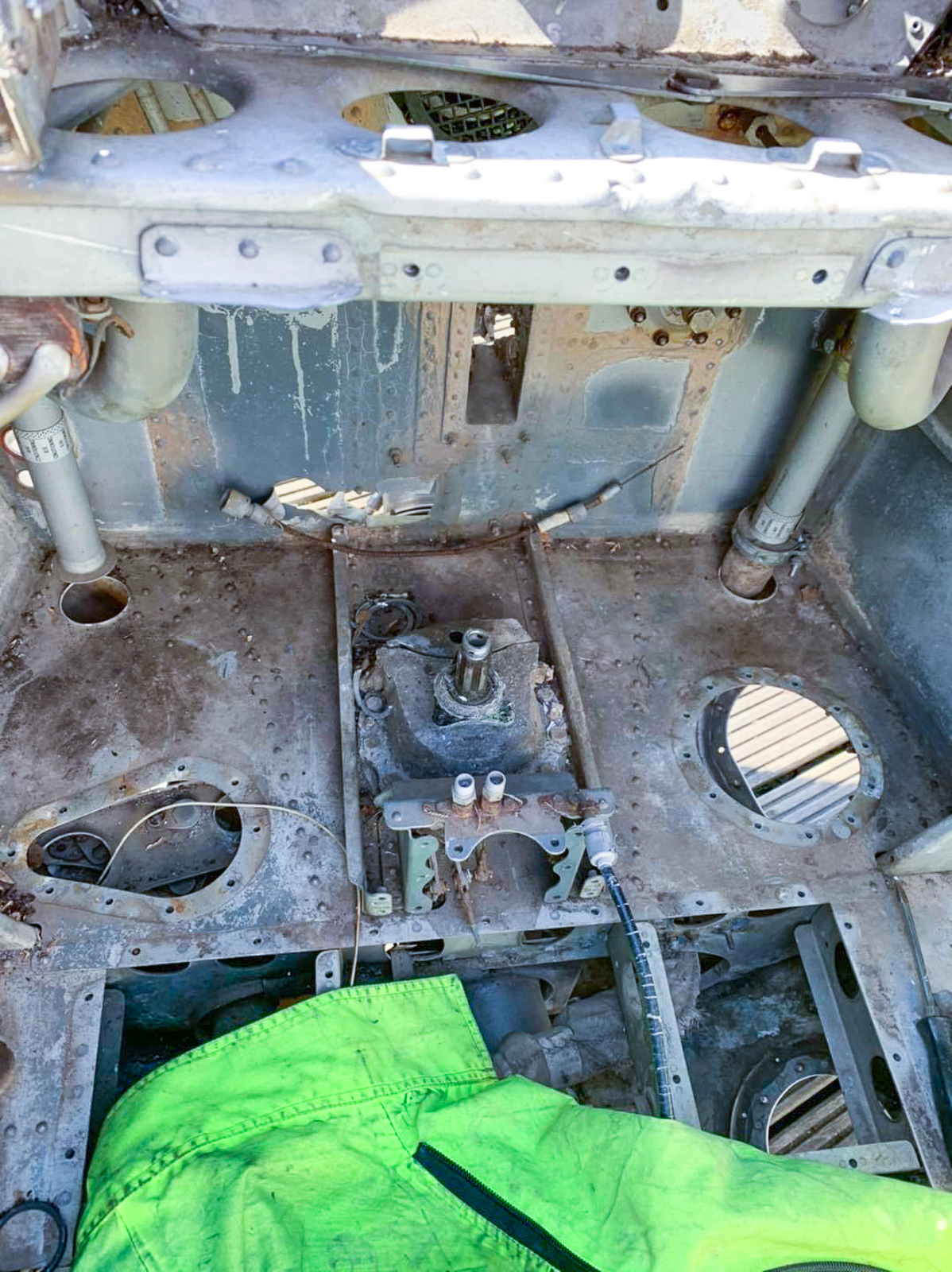 With some of the flooring removed, access to the control stick mounting (center left) is now exposed. You can see a fair bit of surface corrosion in the steel tubing for the elevator torque tube. The bearings for this section were also seized, and required a good deal of ingenuity and elbow greese to remove! (image via Wings Museum)