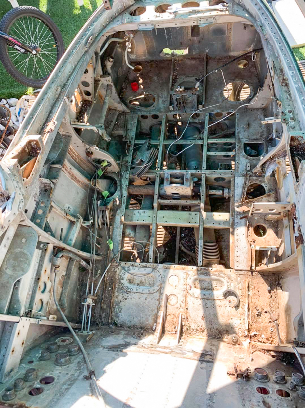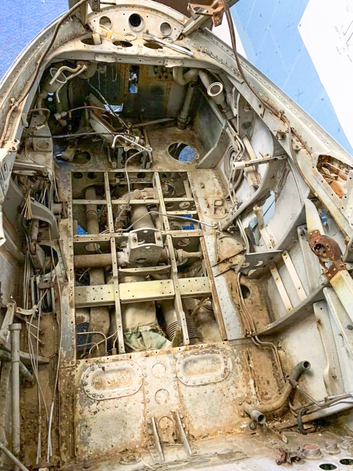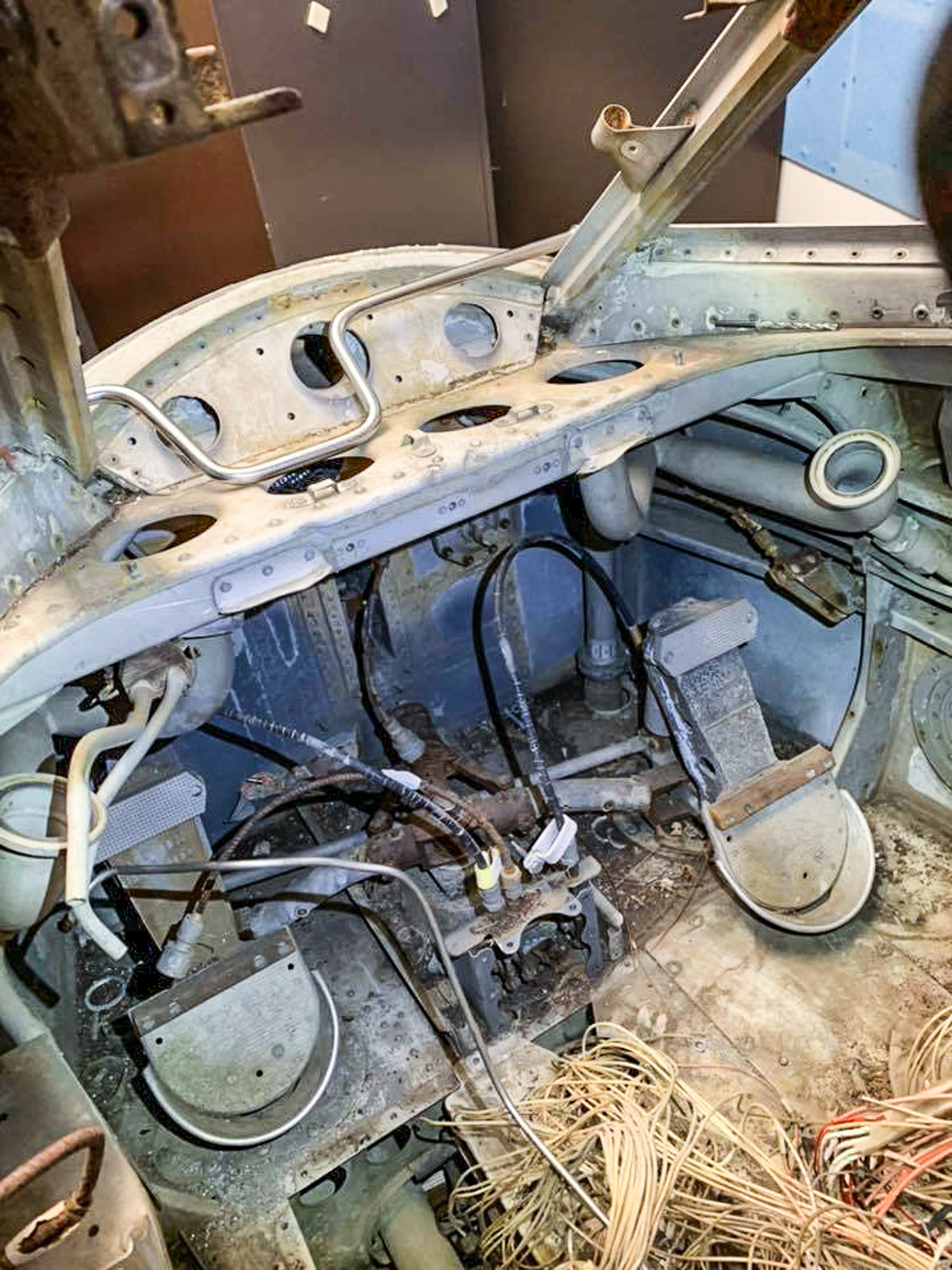 The stripped cockpit, with just the rudder pedal mounting assembly left to remove. (image via Wings Museum)