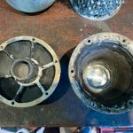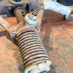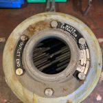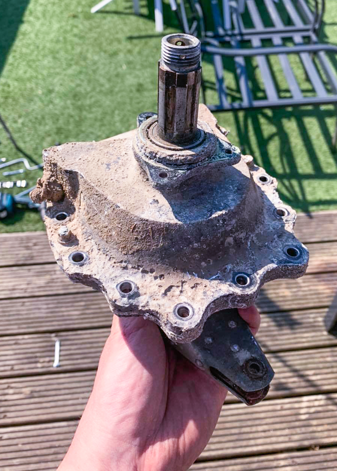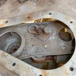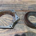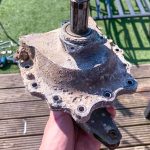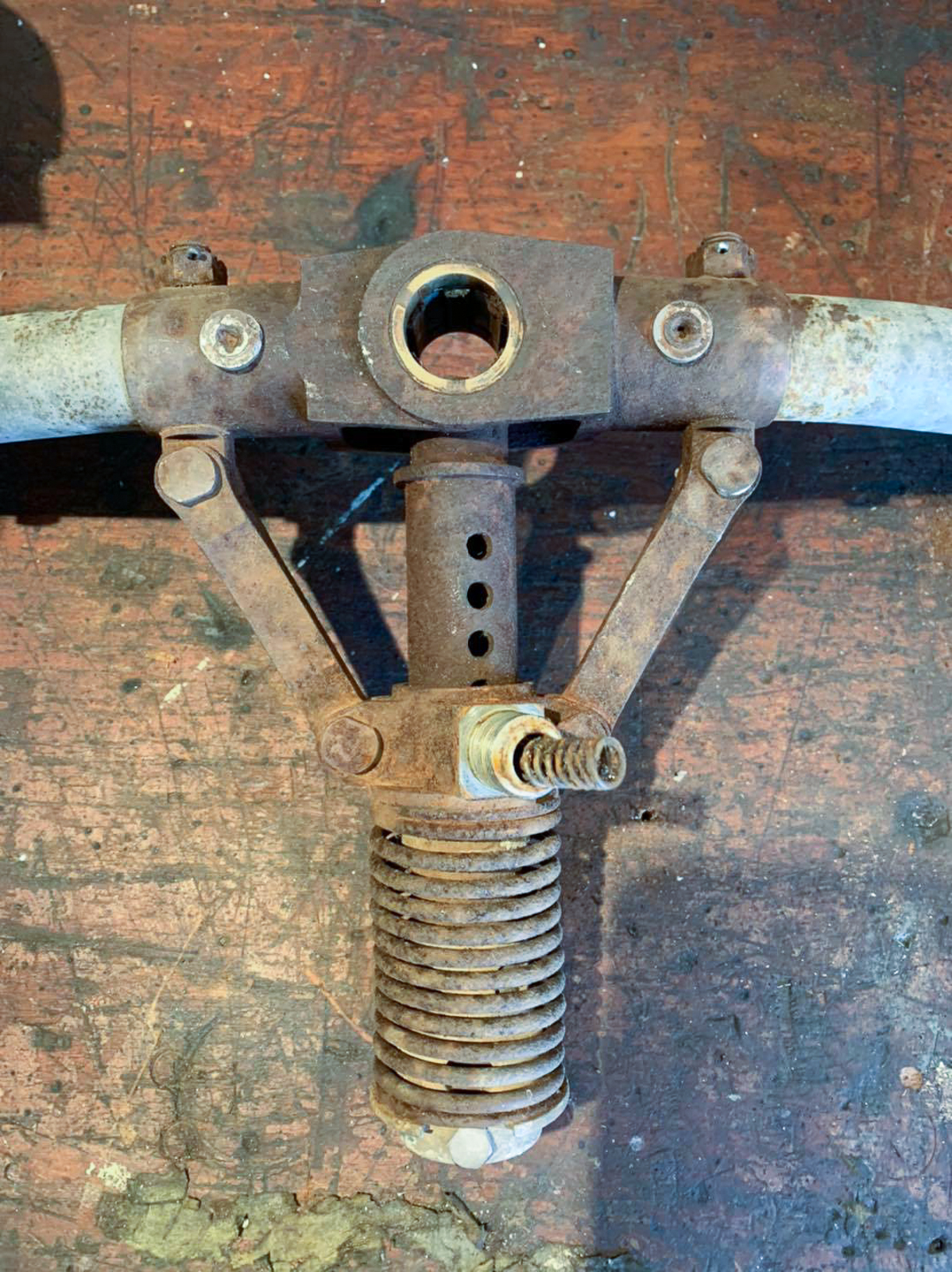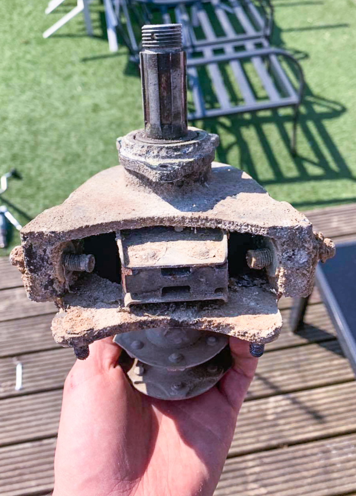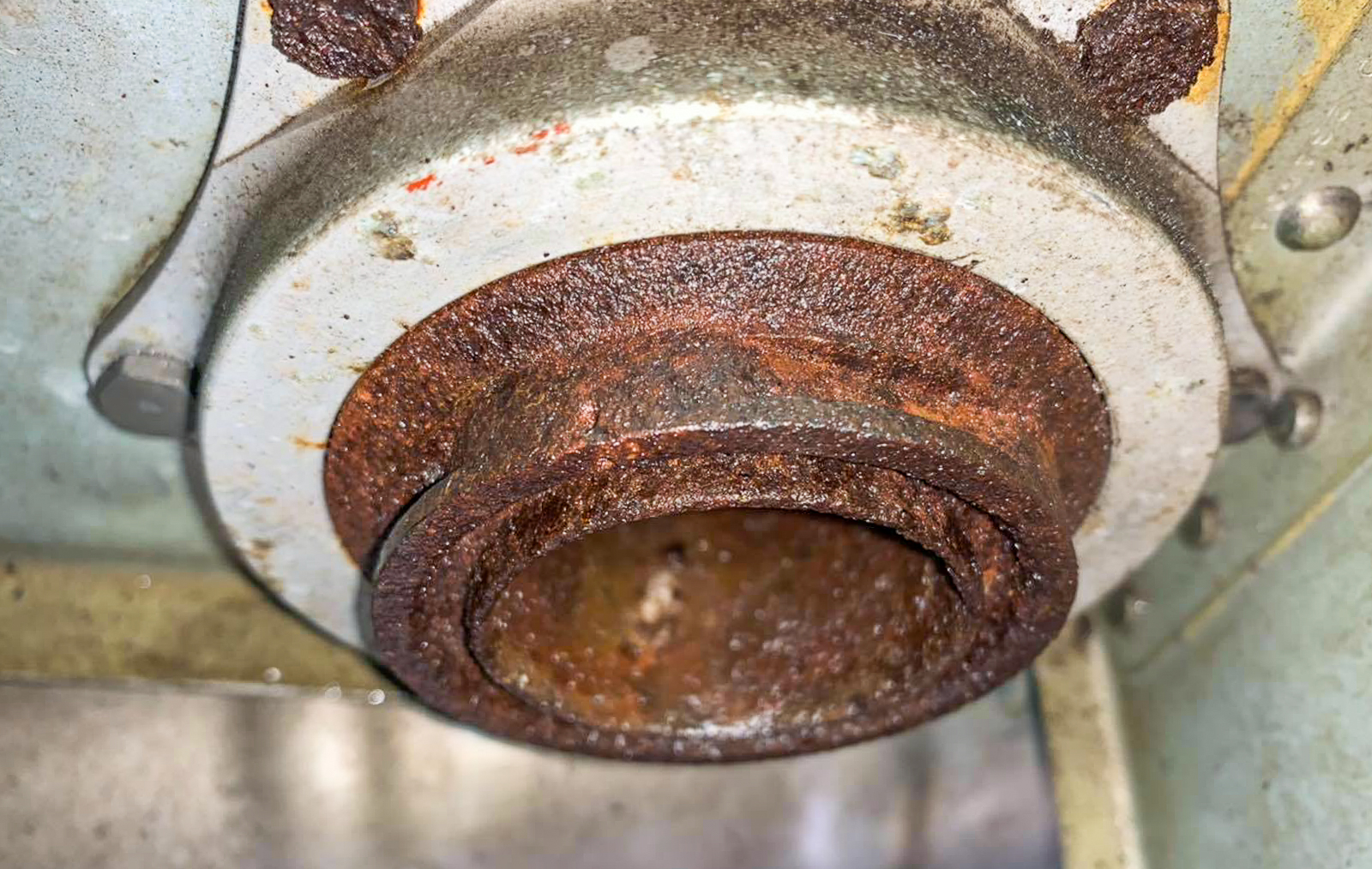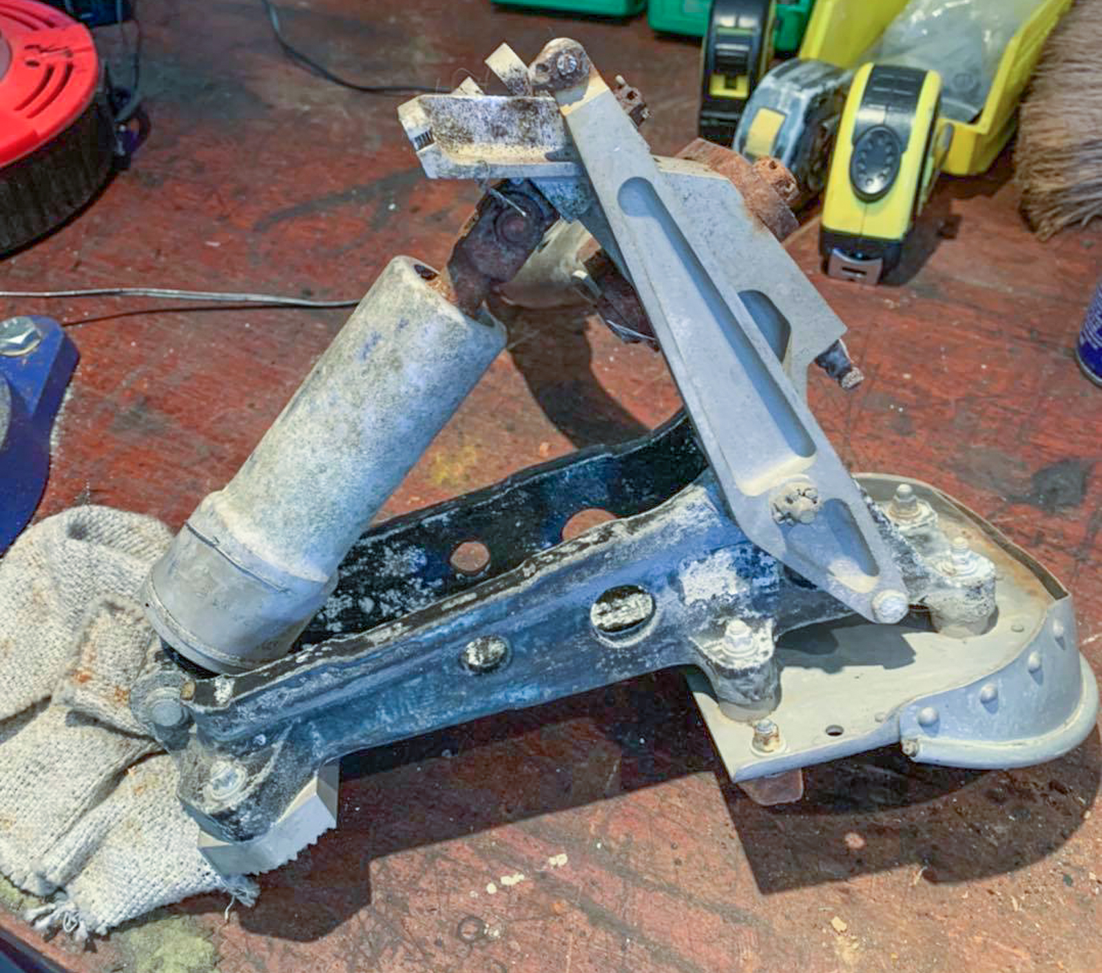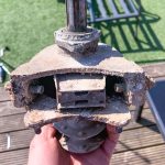 One of the two elevator torque tube ends following its removal from the airframe. The mount (with its seized bearing) is on the left, while the torque tube shaft end is on the right. (image via Wings Museum)