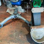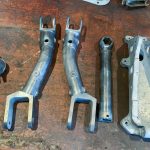 More rudder pedal assembly components following cleaning. The two main rods in the center attach the pedals to the main hub assembly. (image via Wings Museum)