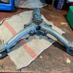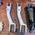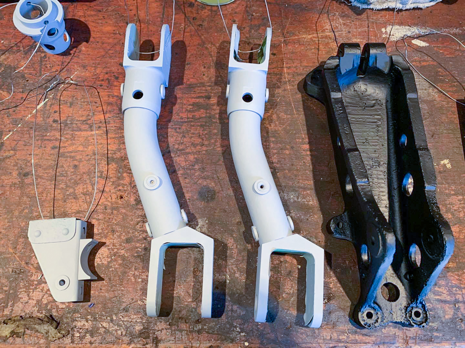 The rudder pedal mounting arms following their coating of primer paint. (image via Wings Museum)