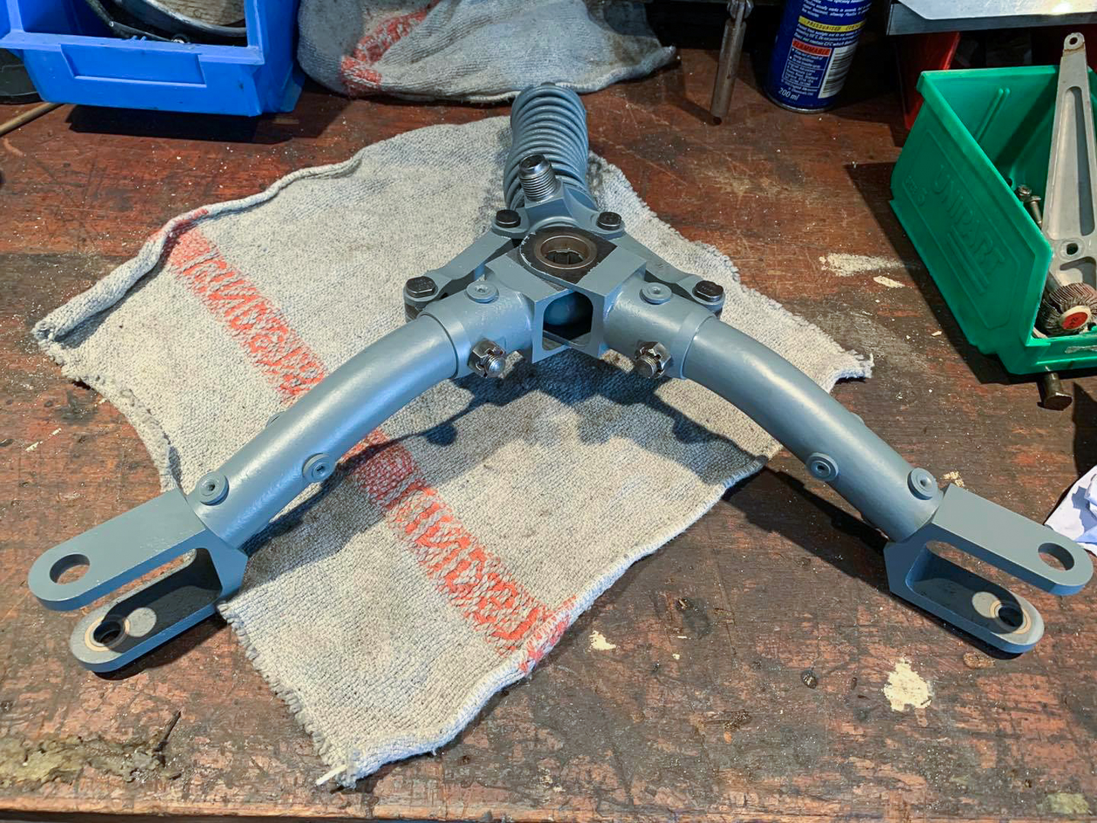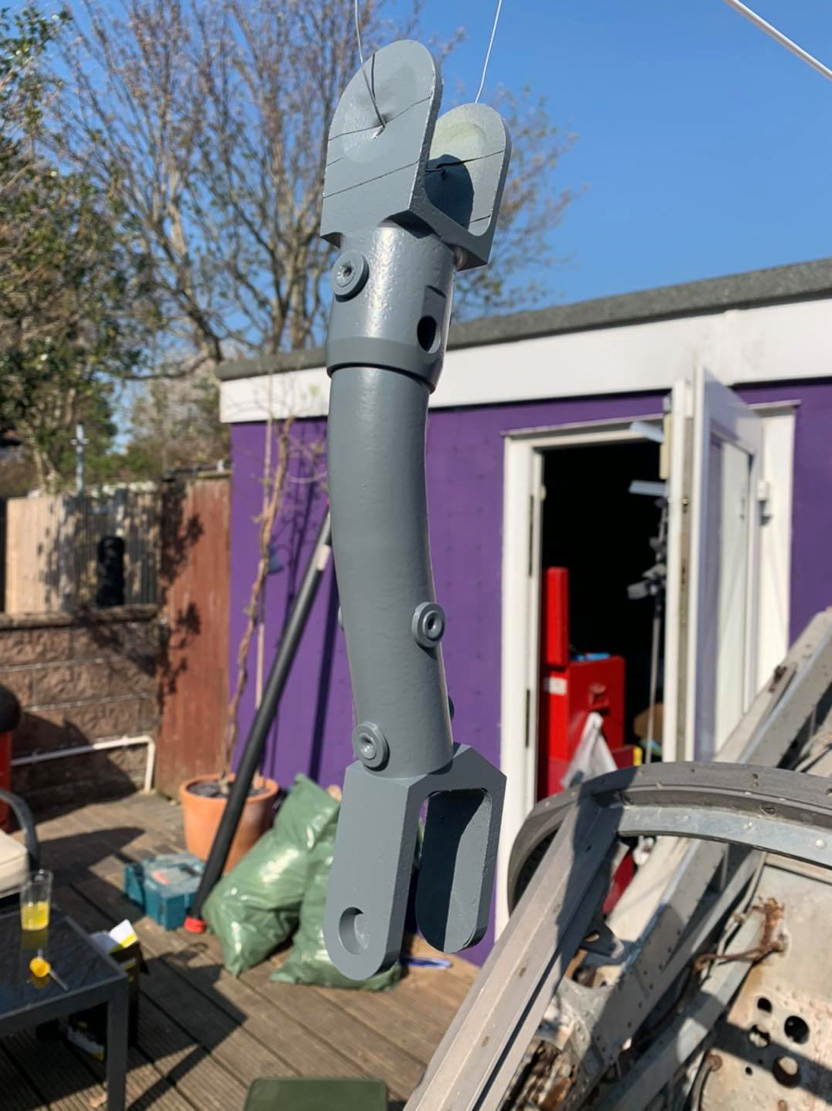 One of the rudder pedal mounting arms following its final paint. (image via Wings Museum)