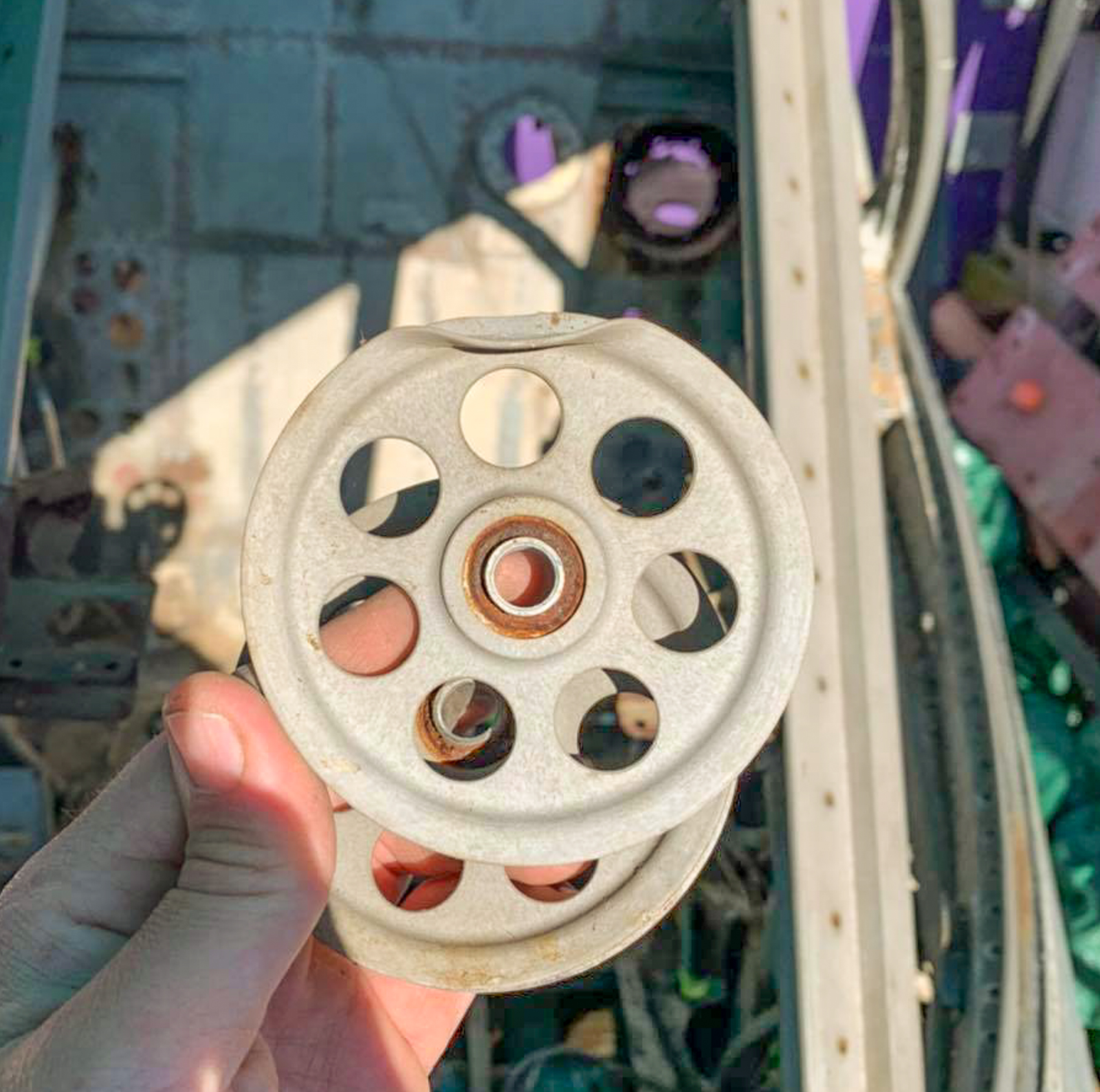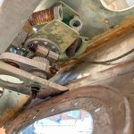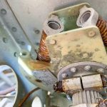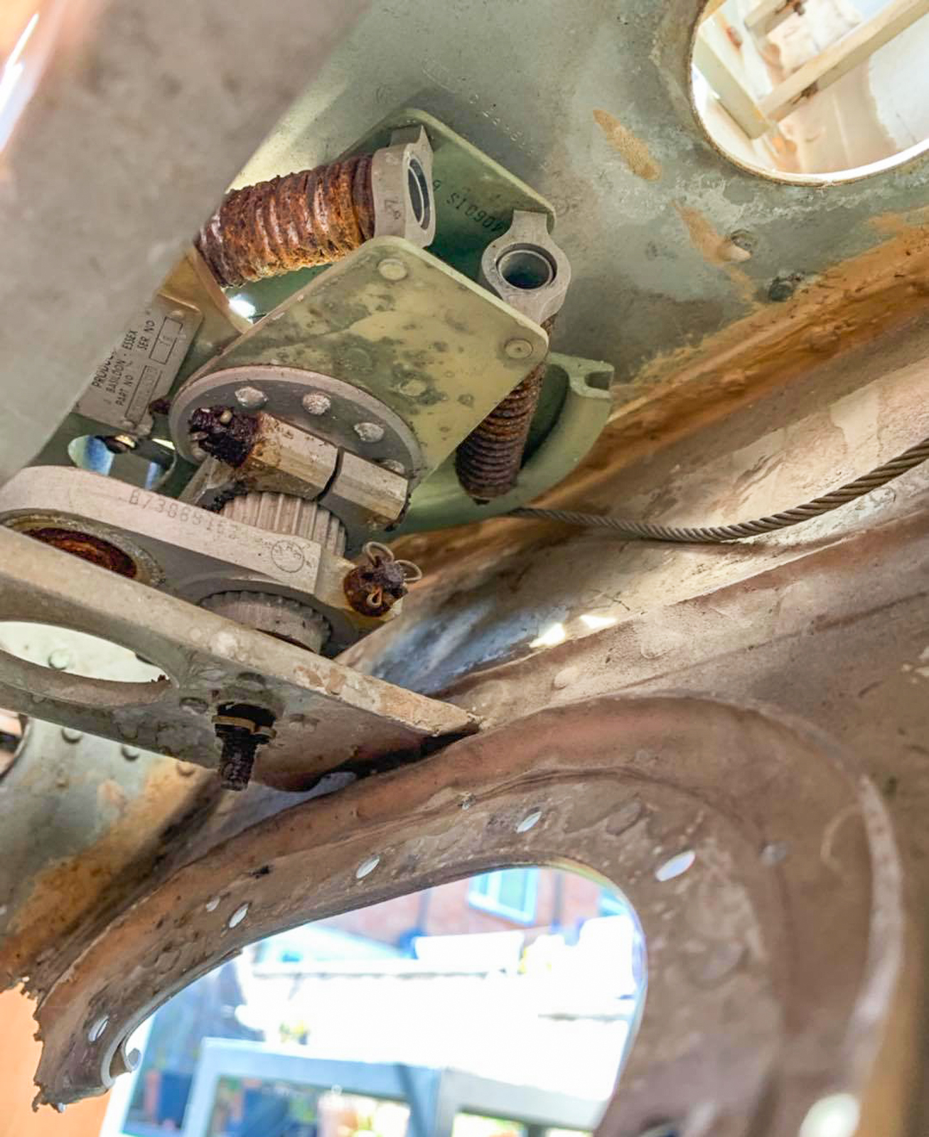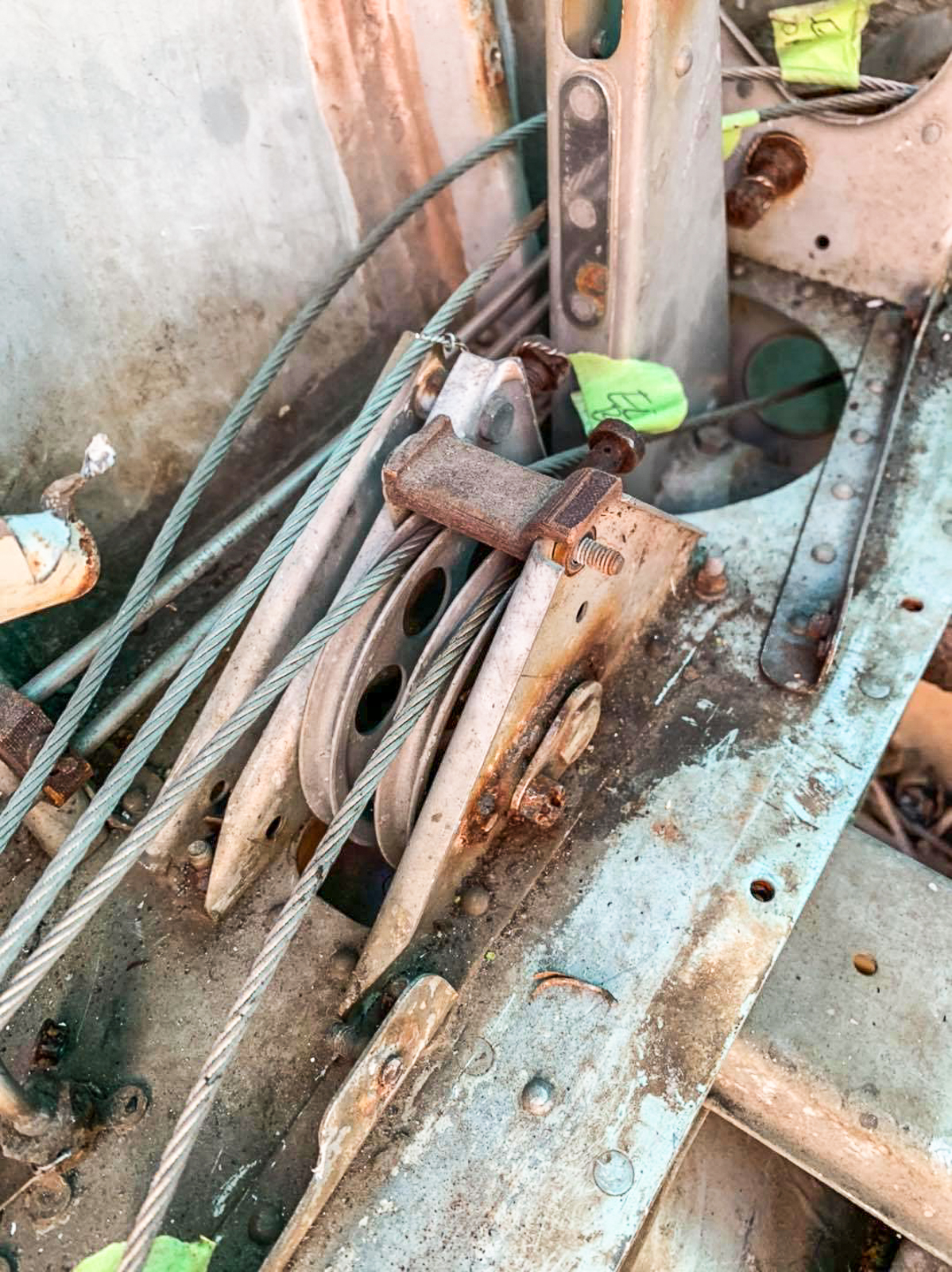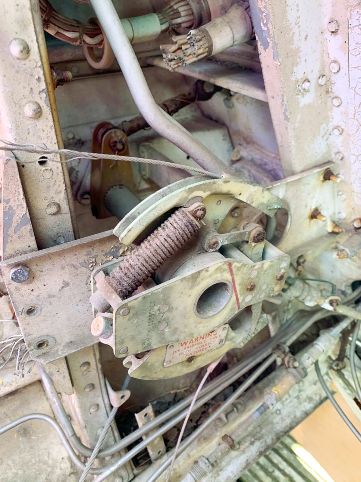 One of the control line pulley assemblies associated with the elevator in the cockpit prior to its removal. Aaron Simmons placed the reflective tape on the cables to identify them for later re-installation once the restoration starts coming back together again. (image via Wings Museum)