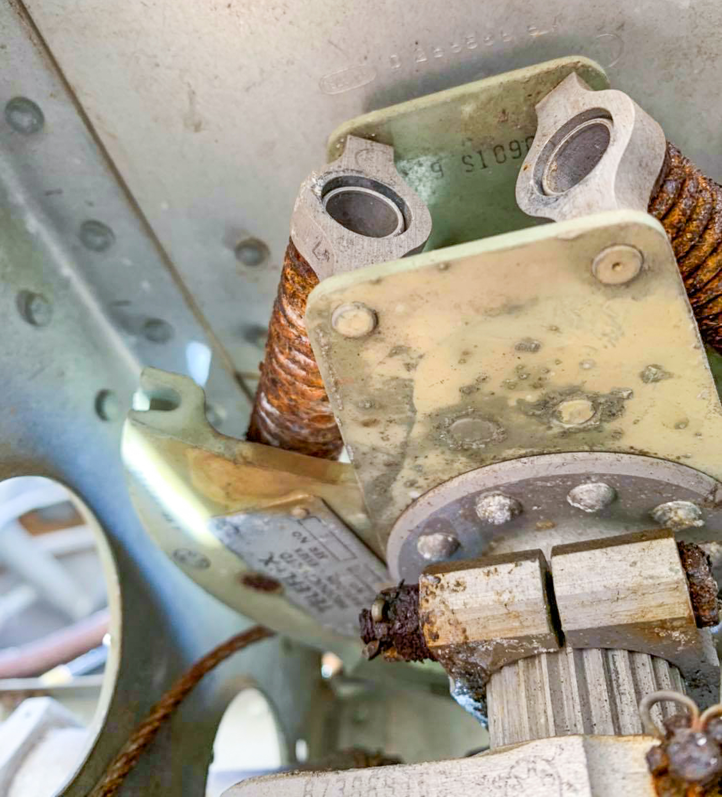 A view of the aileron cable tension regulator as seen from below the cockpit floor. (image via Wings Museum)