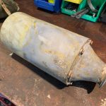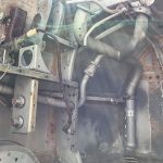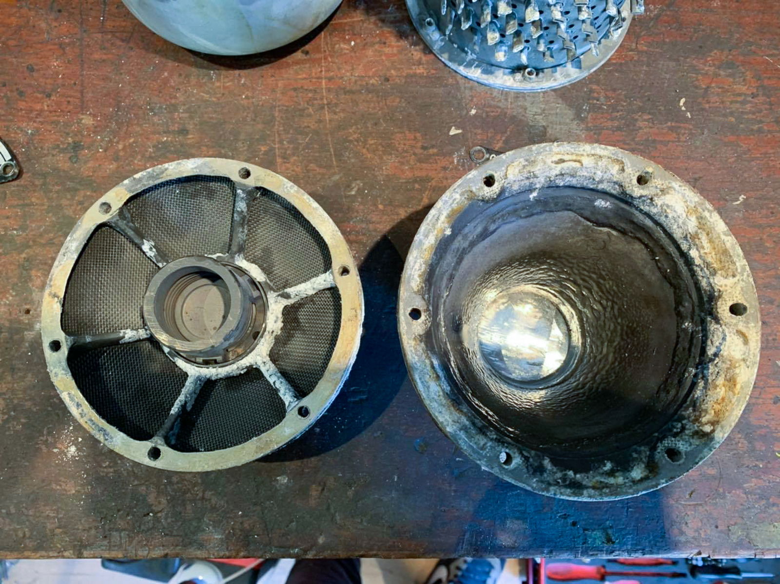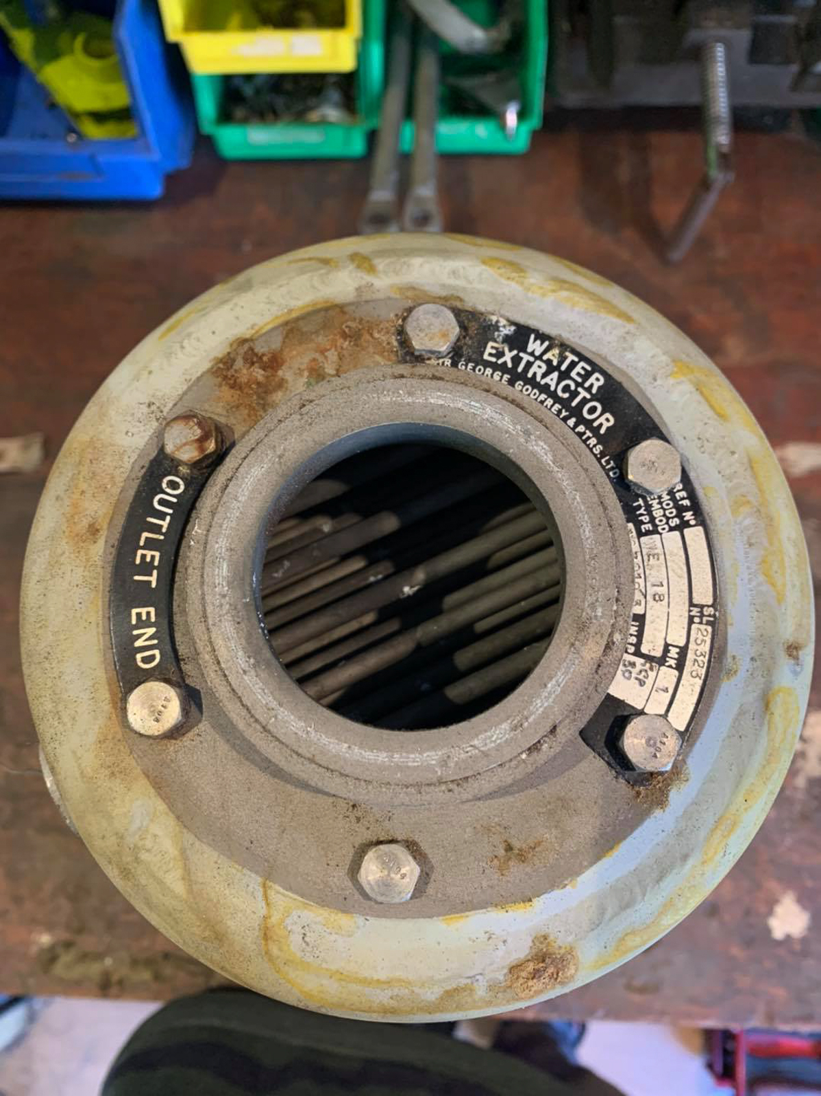 The component parts of the water extractor following its disassembly, but prior to cleaning. There was quite a bit of corrosion, which was removed. The parts were then coated in a corrosion inhibitor internally prior to system reassembly. (image via Wings Museum)
