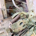 A closeup of the rudder pedal assembly mounting mechanism prior to its removal from the cockpit. (photo via Wings Museum)