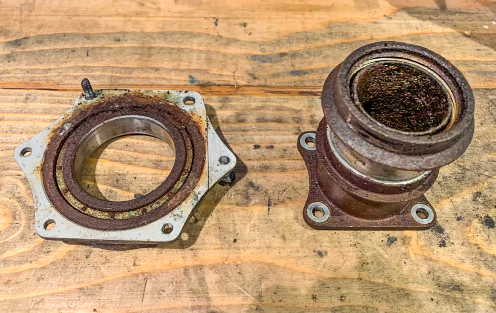 The seized bearing, and its housing, which Aaron Simmons was able to remove from the elevator control torque tube assembly. (image via Wings Museum)