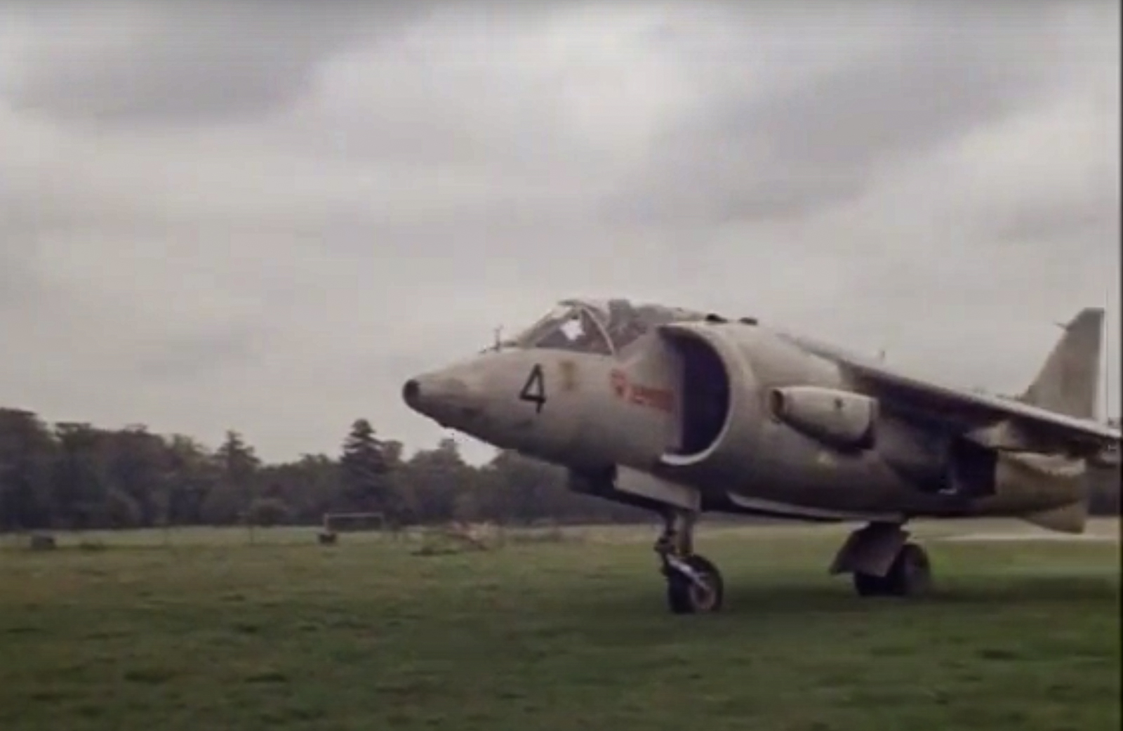 Kestrel XS694 taxiing over grass into her woodland garage. A screen capture from a 1965 PR film. (image via Wings Museum)