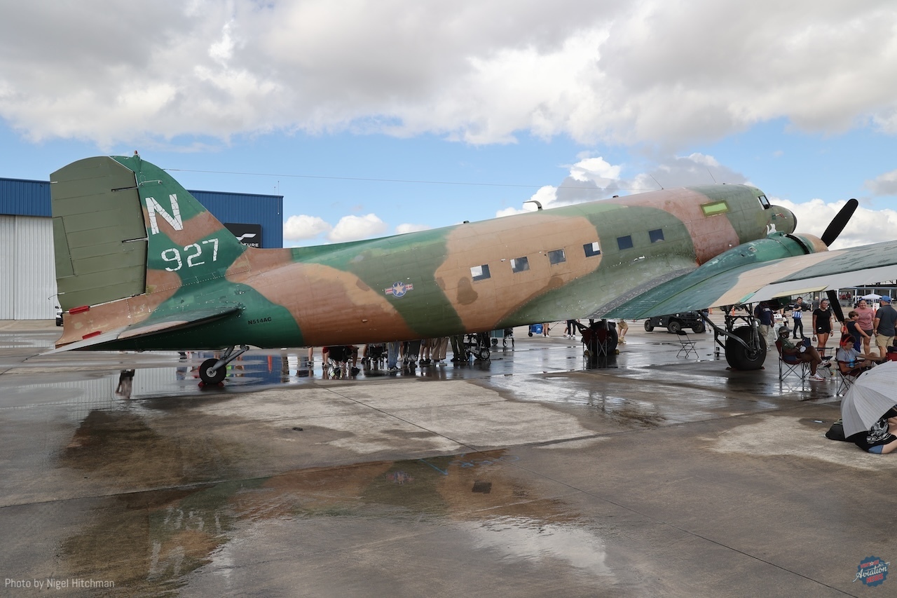 Other jets on static display included the Collings Foundation’s T-33A N648 and the Vietnam War Flight Museum’s MiG-17 N17HQ and BAC Jet Provost T5 N800LT/XW369. NASA had a small presence in the static display with one T-38 and, of more interest, the Martin WB-57 N927NA. Unfortunately, this is the aircraft that suffered a belly landing in January. Making its first public appearance since being acquired by the CAF Gulf Coast Wing was the Douglas AC-47 Spooky N514AC, which had been at CAF Headquarters in Dallas, undergoing extensive work and after the show, flew to Atlanta to be painted. There were several other warbird trainers and liaison aircraft that flew, and even a few flypasts by a United Airlines 777.