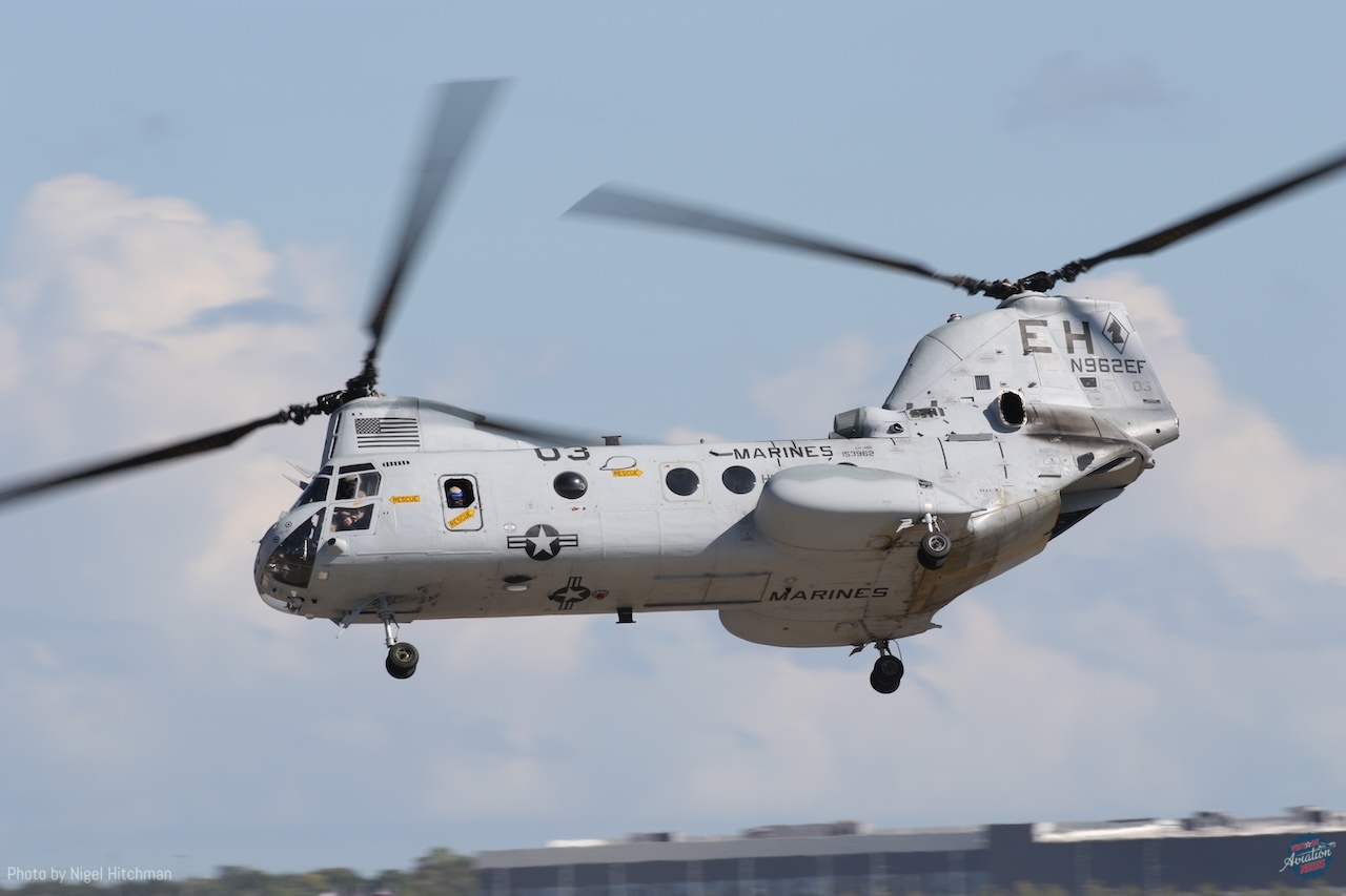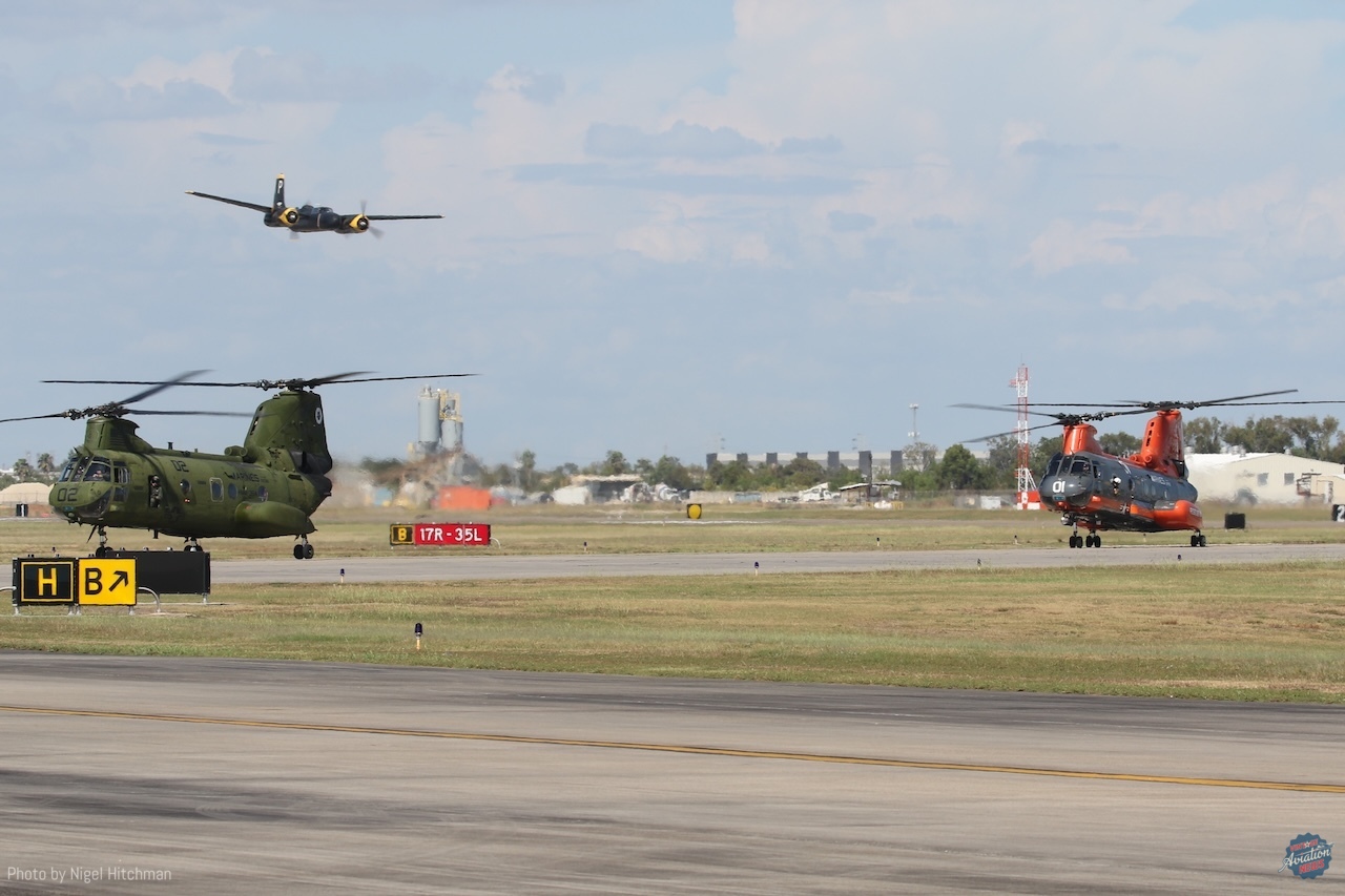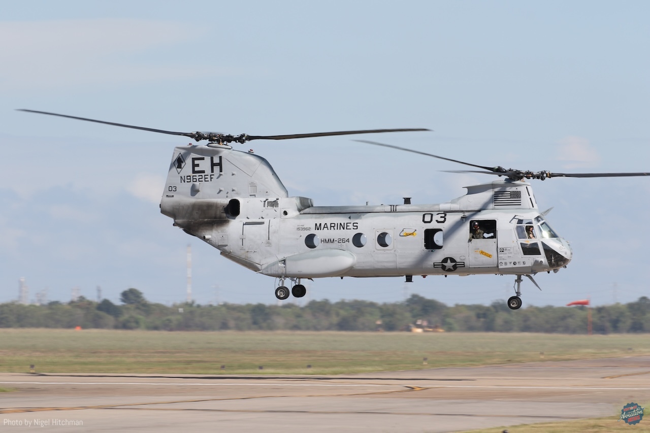 The other big highlight for me was seeing the three Vertol CH-46 Sea Knights flying in the display. These are owned by the National United States Armed Forces Museum in Houston and operated by their aviation squadron based at Ellington, where the show is held. They have five airworthy CH-46s, four of which were flown from Davis–Monthan after refurbishment at the Pima County Air Museum in late 2022, the first having been obtained in 2015. They are kept in and around the Vietnam War Memorial Flight’s hangar, along with their aircraft and some of the Collings Foundation’s flying jets. CH-46s entered service in the 1960s, primarily operated by the U.S. Marine Corps and U.S. Navy for ship-to-shore transportation, serving in Vietnam and the Gulf wars, as well as in Afghanistan. The Navy withdrew them from service in 2011 and the Marines in 2015. It was great to see them flying and something very different from what we usually get to see.