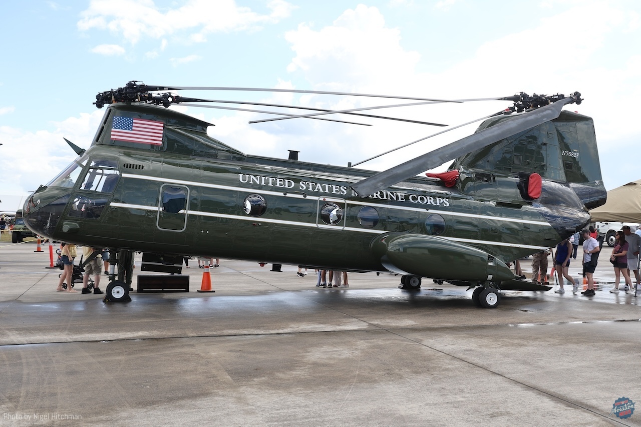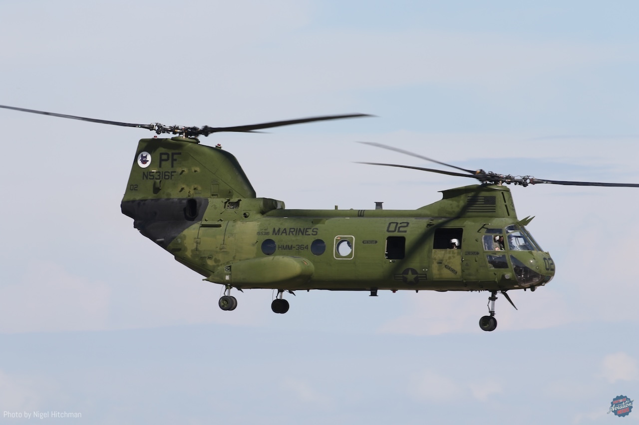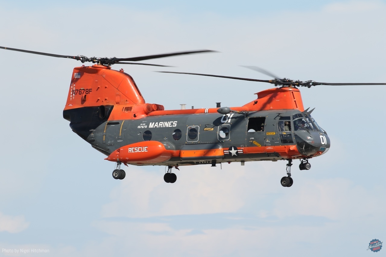 The other big highlight for me was seeing the three Vertol CH-46 Sea Knights flying in the display. These are owned by the National United States Armed Forces Museum in Houston and operated by their aviation squadron based at Ellington, where the show is held. They have five airworthy CH-46s, four of which were flown from Davis–Monthan after refurbishment at the Pima County Air Museum in late 2022, the first having been obtained in 2015. They are kept in and around the Vietnam War Memorial Flight’s hangar, along with their aircraft and some of the Collings Foundation’s flying jets. CH-46s entered service in the 1960s, primarily operated by the U.S. Marine Corps and U.S. Navy for ship-to-shore transportation, serving in Vietnam and the Gulf wars, as well as in Afghanistan. The Navy withdrew them from service in 2011 and the Marines in 2015. It was great to see them flying and something very different from what we usually get to see.