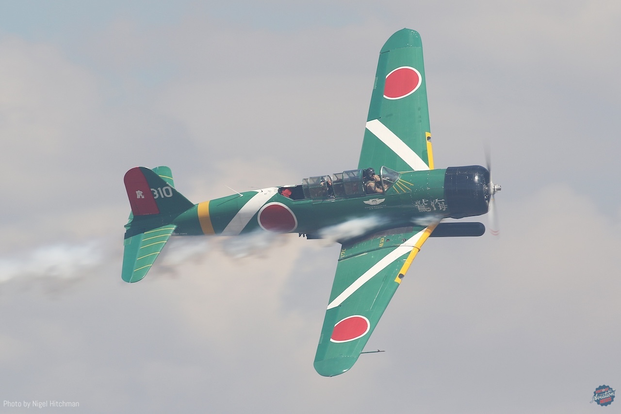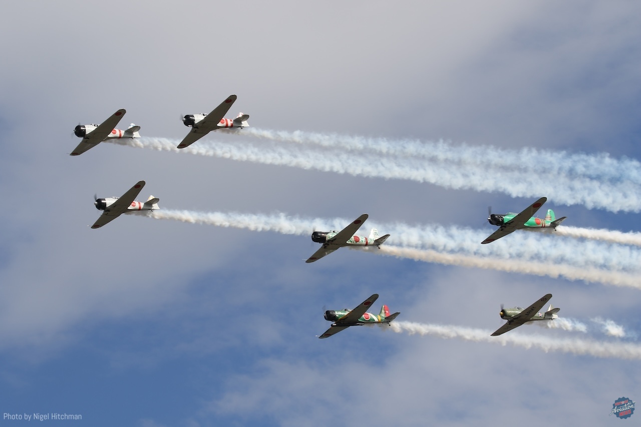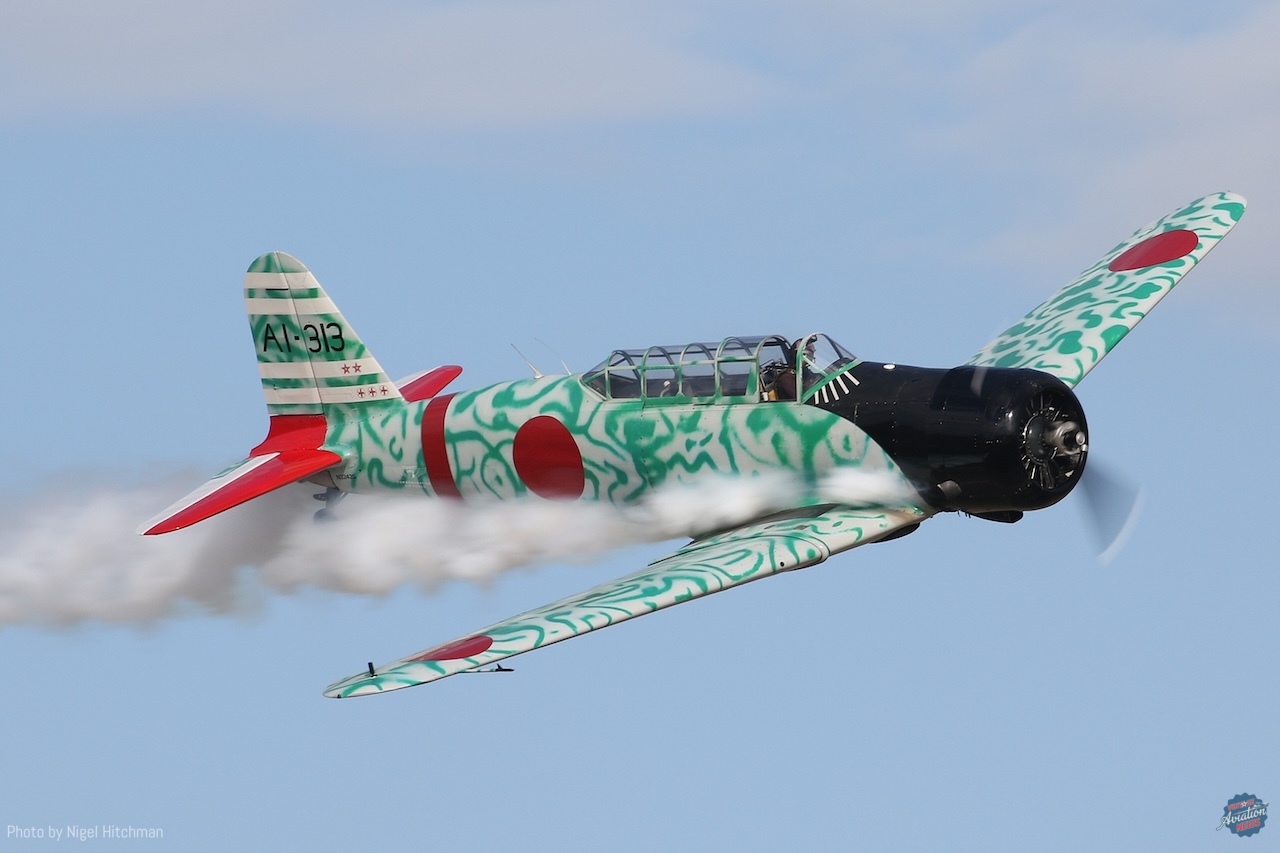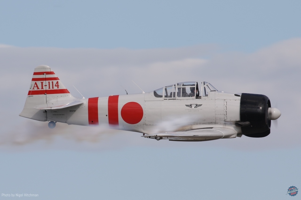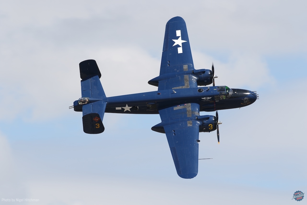 Tora Tora Tora always puts on a good display with their T-6s and BT-13s modified to resemble Mitsubishi Zeros and Nakajima Kates, and usually Aichi Vals, although no Vals were present this time. They also had one T-6 slightly modified and painted to represent a Curtiss P-36 Hawk, of which there were some at Pearl Harbor on the day of the attack. They were also joined by the B-25 Devil Dog, representing one of the B-17 bombers returning to base from a training mission during the attack. With much of their “attack” hidden behind the tents and in the smoke with an on-crowd light wind, it was good that most of the aircraft ended their display with a nice topside pass.