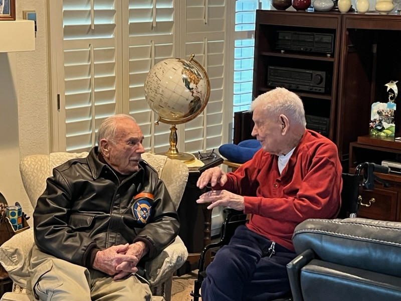 An historic meeting of two WWII P-51 Mustang pilots took place on March 12th in Auburn, California. Triple-ace Brigadier General C.E. “Bud” Anderson USAF (Ret.) (102 years old) hosted Colonel Joe Peterburs USAF (Ret.) (99 years old) for an afternoon of sharing historic flying stories. Most readers are familiar with Gen. Anderson’s story and significant military background: he is the only living triple-ace, with 16 1⁄4 aerial victories, and served in Korea and Southeast Asia as well as having a significant test pilot career before retiring with 30 years of military service. Col. Peterburs’ story and background may not be as well known.