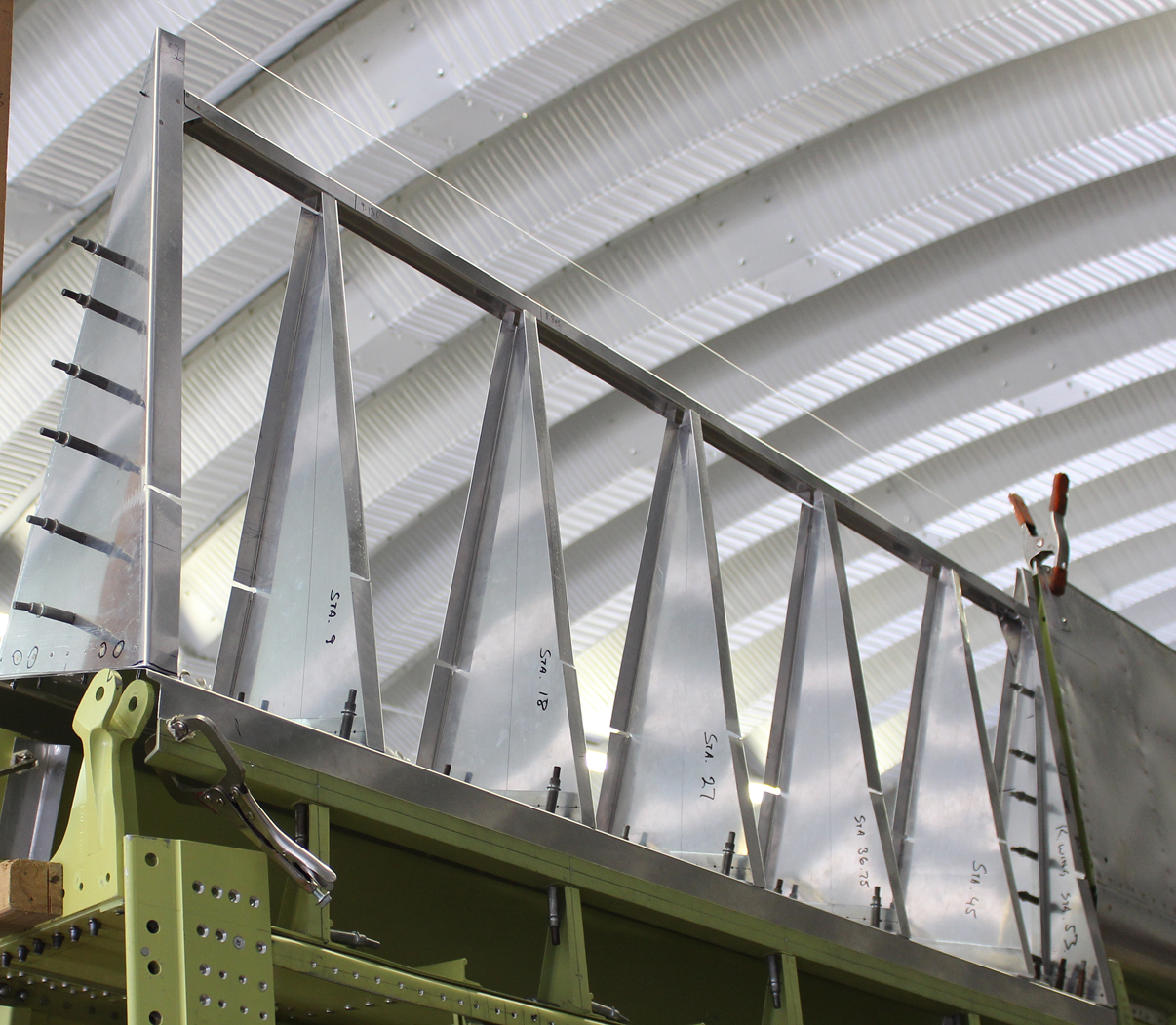 All wing trailing edges and aileron hinge points are now completed and permanently riveted to the structure.