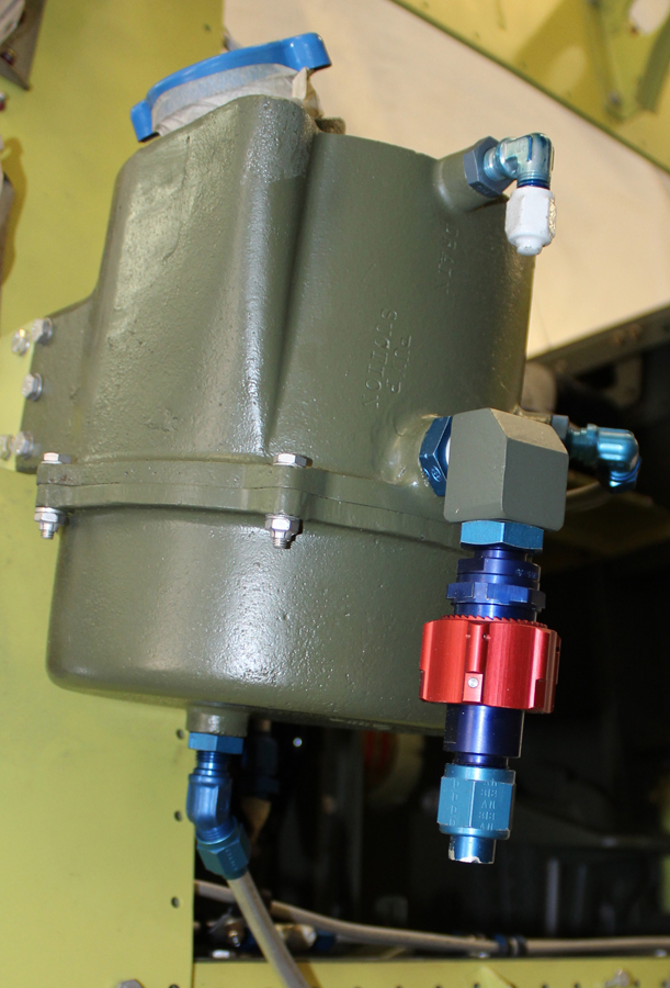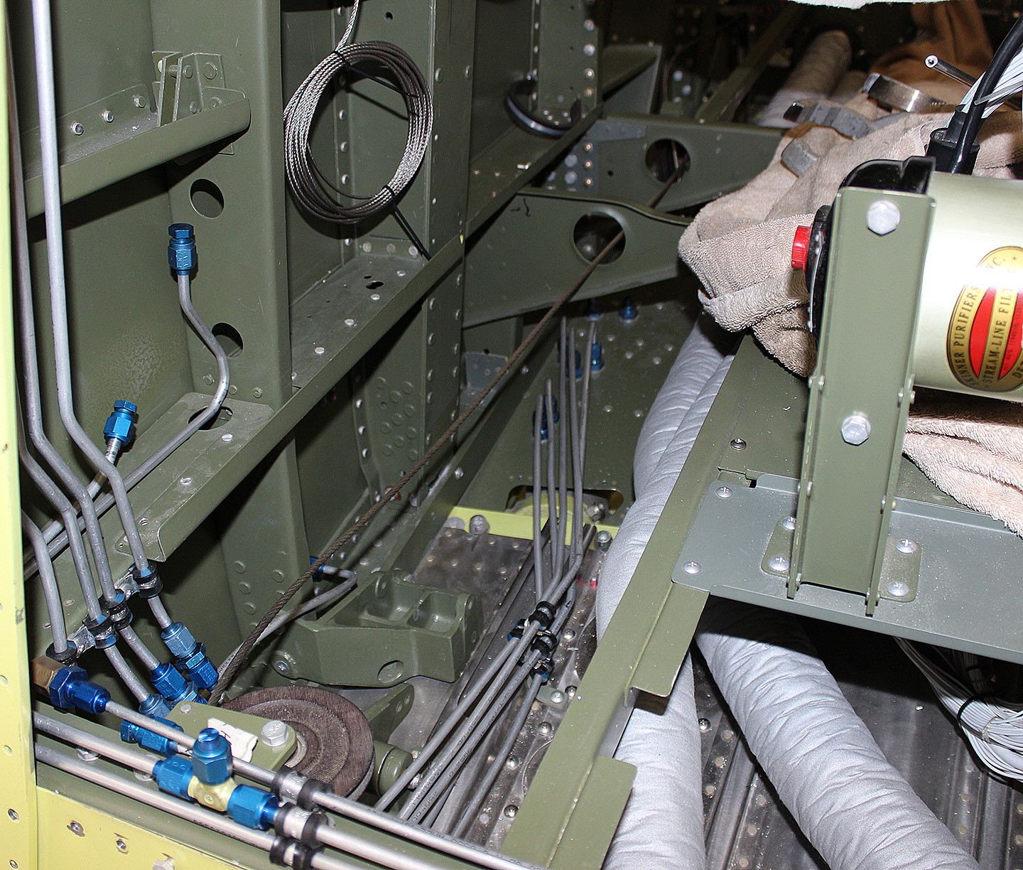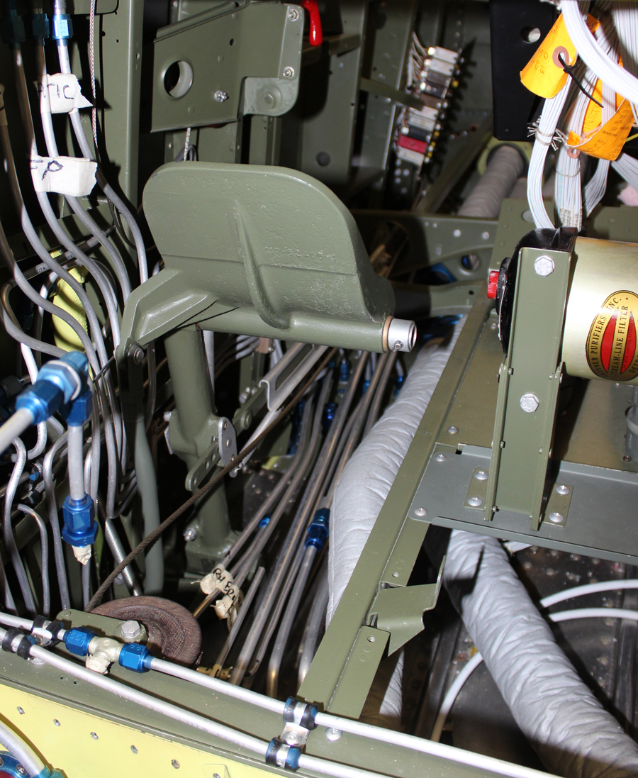 The majority of the lines running along both cockpit floors, and up behind and through each firewall are now finished. Reilly noted that it has been difficult to duplicate the exact routing for each line as most of them were removed in the early 1950s during the disassembly of the fuselage from the center section. Reilly stated that his team was able to accurately determine the routing by locating the through-fittings in the center section floor, and the line mounts on each longeron. The drawings Reilly has only showed the routing for the P-82B and later model fuselages, although a number of them do have the same routing as on the XP-82. The hydraulic tank which mounts to the firewall is now finished, including the fuselage suction feed/return, and pressure lines.