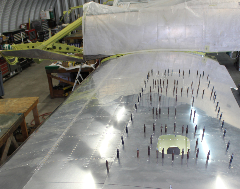 The remainder of the top inboard skins are now finished through their structural highshear riveting (special collared steel rivets through the wing-attach angles and stringers). On both wings, the crew has three of the four top skins completed along with the two lower inboard skins at the attach angles.