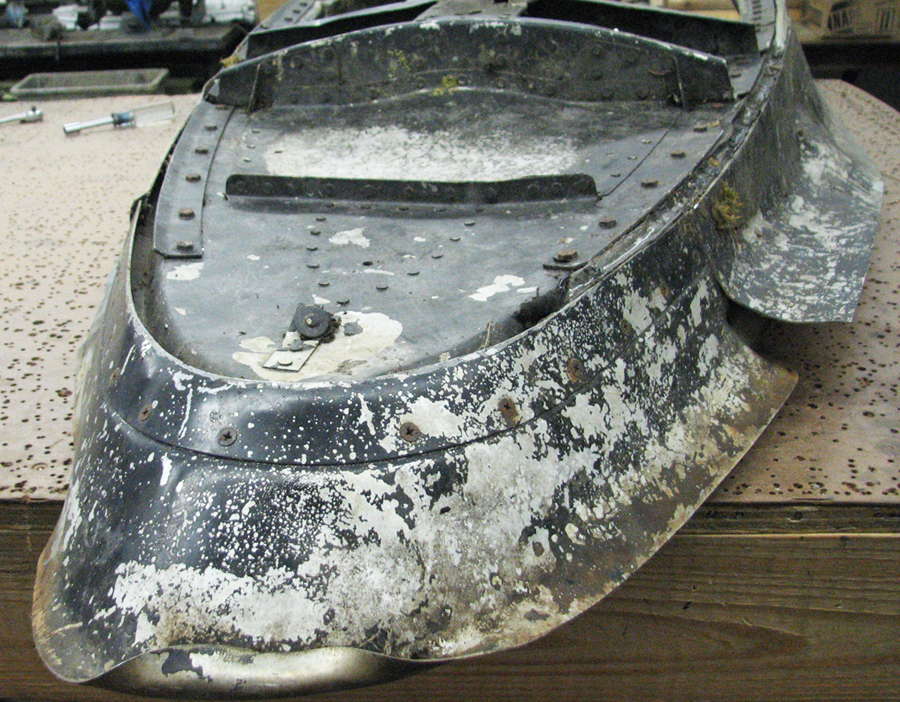 The right-hand glare shield was another story. The left-hand glare shield was relatively simple restore, as it was basically undamaged. The heavily damaged, right-hand glare shield required a major amount of repair and the splicing together of many re-pressed parts to complete an airworthy unit.