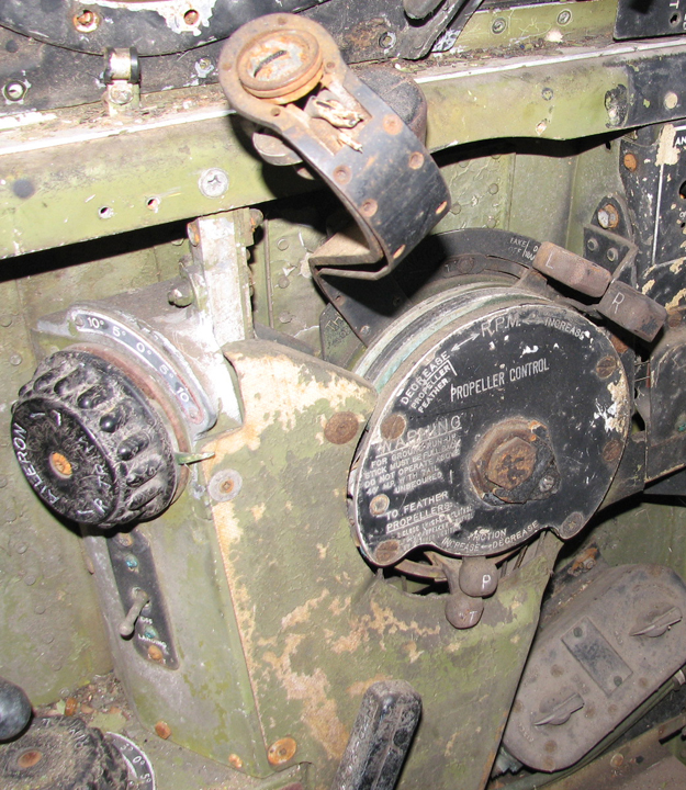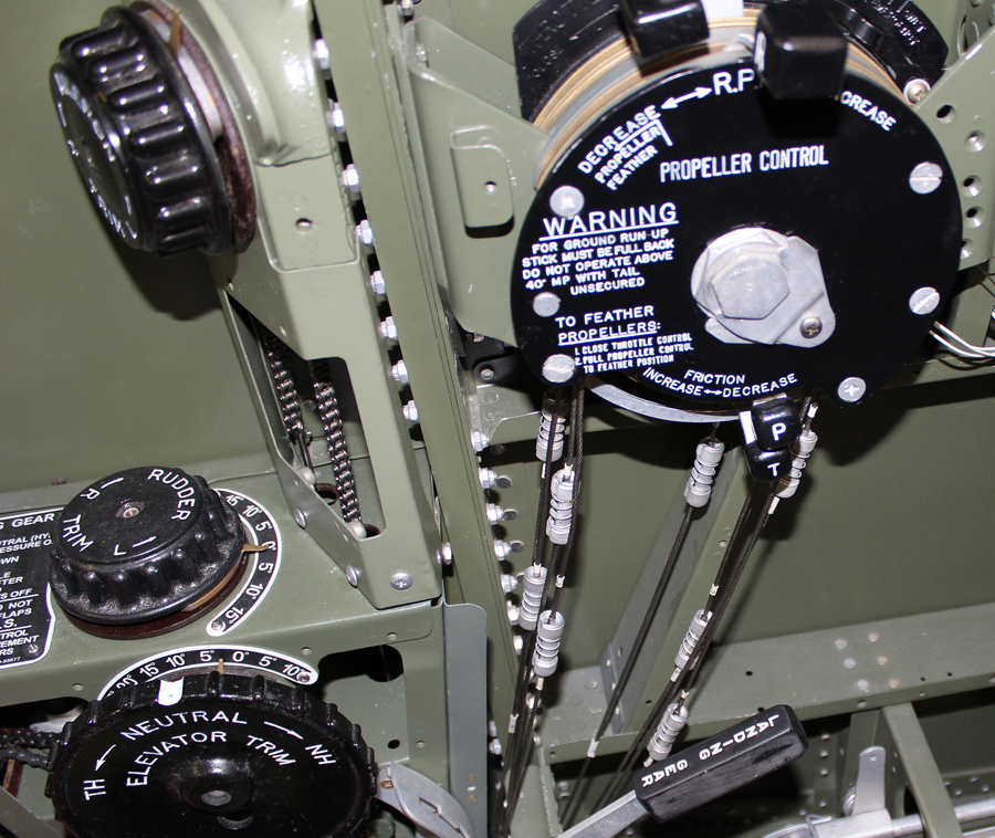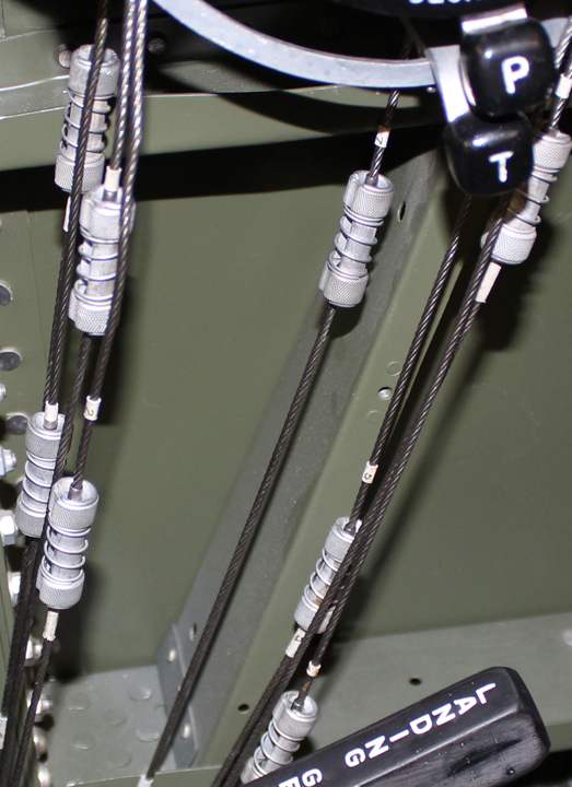 One restoration team member is currently completing all of the cable hook-ups that simultaneously link both throttle quadrants together via cables that run through the center section from one cockpit to the other.