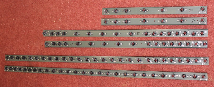 The XP-82’s wing-attach angles require nut plate channels for the bolts to fasten into due to the lack of access for tightening standard nuts. For some reason, North American chose to use nut plate channels with nonstandard spacing on the upper sides of the lower attach angles located in the fuel tank bays. None of the project’s original nut plate channels were repairable, and the non-standard spacing made it impossible to purchase replacements from any supplier as they are no longer manufactured. Therefore the restoration team had to manufacture their own nut plate channel strips.