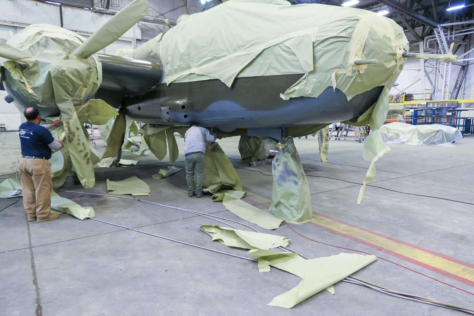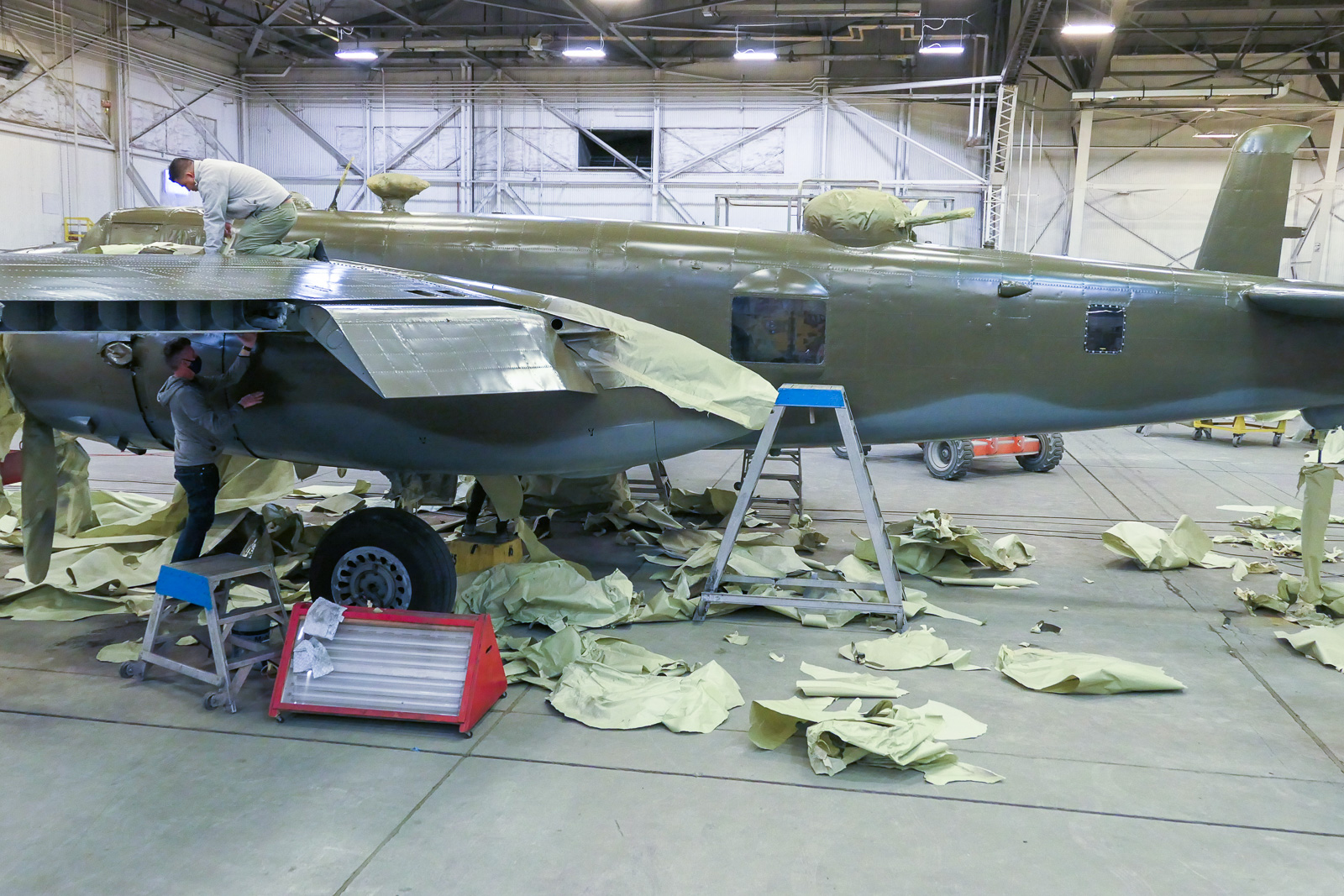 The B-25 repainting project could not have been accomplished without a crew of museum volunteers who traveled to Oscoda, spent a few overnights, and took time away from their families this holiday season. Like many non-profit organizations, Yankee Air Museum could not fulfill its mission without the time, skills and labor donated to it by volunteers. With heartfelt appreciation, these B-25 project members are recognized: Paul Hakala, Chief of Maintenance; Angel Estrada, B-25 Crew Chief; and volunteers: Grant Schwartz, Darrel Bazman, Brian Gawronski, Rich Koski, Nick Consiglio, Tim Wedig, Eric Esckelson, Luke Noble, Bob Bailey, Joe Provost, Gene Wedekemper, Justin Walsh and Patrick Trevas. The B-25 pilots for this mission, flying without heat in the cockpit: Mike Vetter and Delane Buttacavoli.